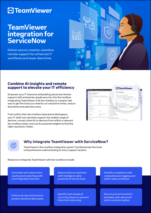 Download this guide to find out how a TeamViewer-ServiceNow integration can help you achieve your business, technology and efficiency goals.