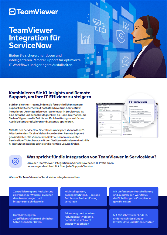 Stärken Sie Ihre IT-Teams, indem Sie fortschrittlichen Remote Support mit Sicherheit auf höchstem Niveau in ServiceNow integrieren. Die Integration von TeamViewer in ServiceNow ist eine einfache und schnelle Möglichkeit, die Tools zu erhalten, die Sie benötigen, um die Zeit bis zur Problemlösung zu verkürzen, Ausfallzeiten zu reduzieren und Kosten zu optimieren.