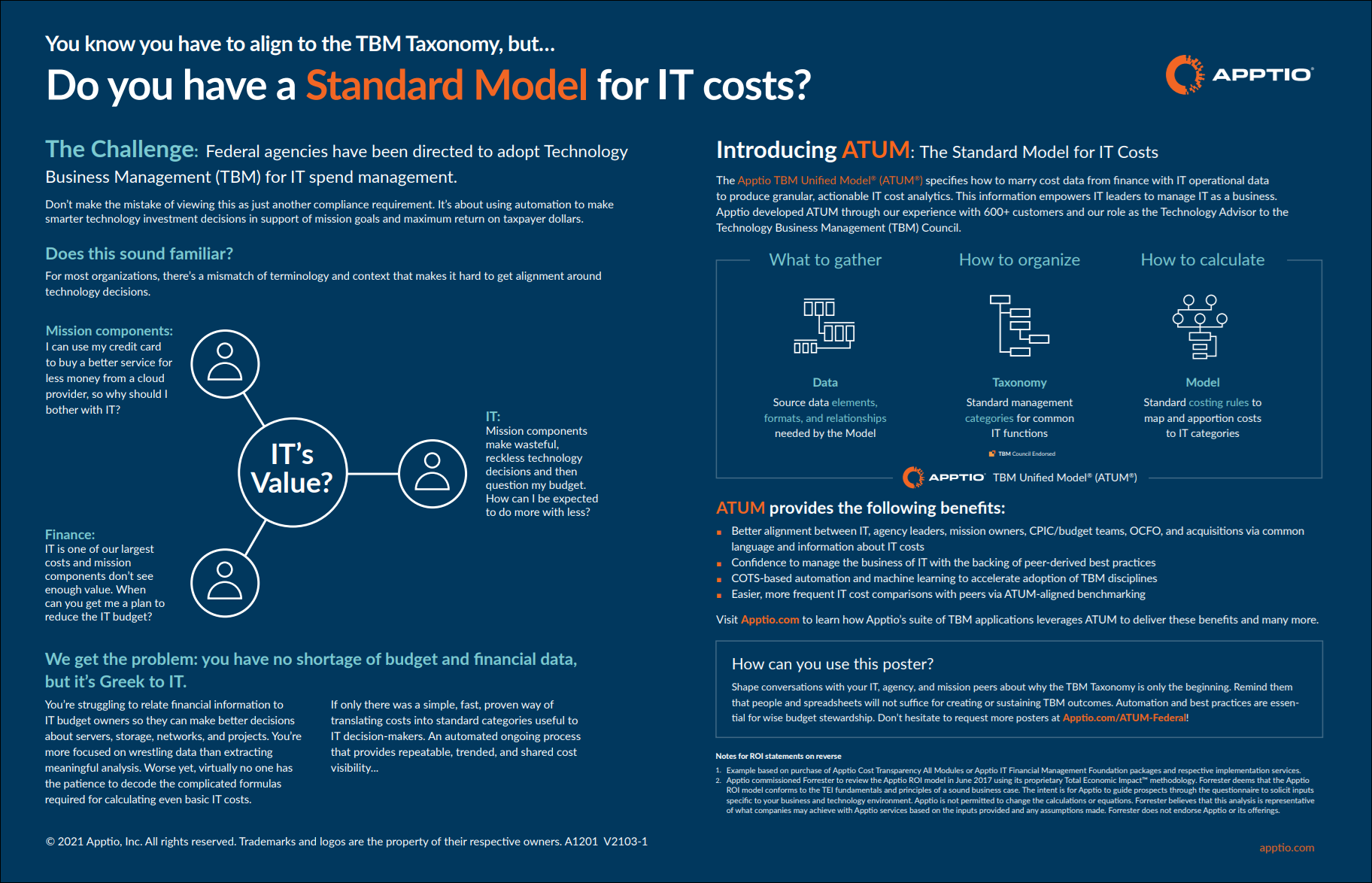 The Apptio TBM Unified Model® (ATUM®) specifies how to marry cost data from finance with IT operational data to produce granular, actionable IT cost analytics. This information empowers IT leaders to manage IT as a business. Apptio developed ATUM through our experience with 600+ customers and our role as the Technology Advisor to the Technology Business Management (TBM) Council.
