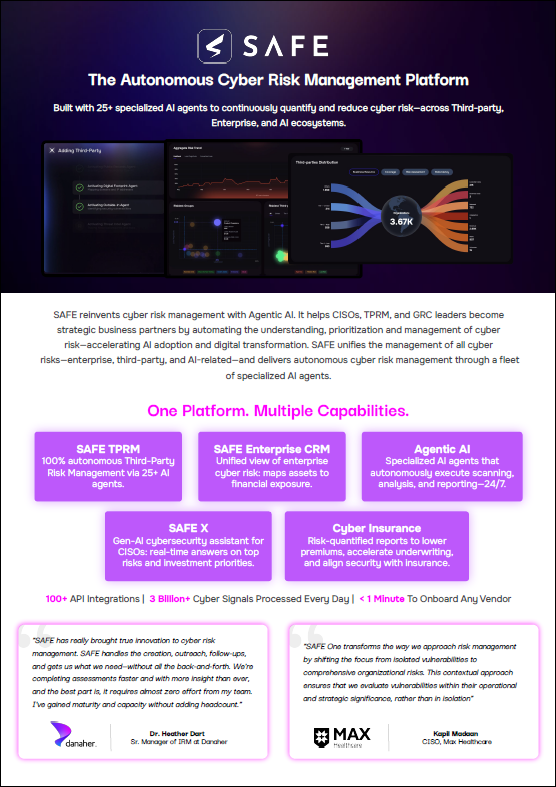 SAFE reinvents cyber risk management with Agentic AI. It helps CISOs, TPRM, and GRC leaders become strategic business partners by automating the understanding, prioritization and management of cyber risk—accelerating AI adoption and digital transformation. SAFE unifies the management of all cyber risks—enterprise, third-party, and AI-related—and delivers autonomous cyber risk management through a fleet of specialized AI agents.