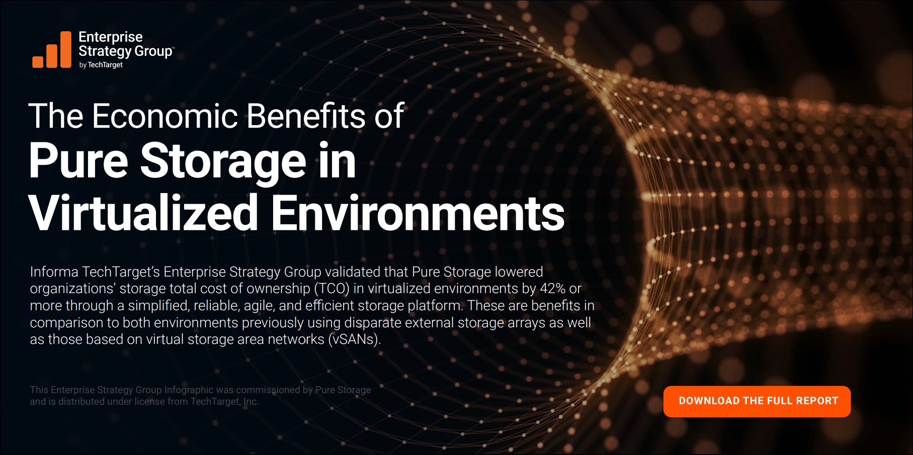 Informa TechTarget’s Enterprise Strategy Group validated that Pure Storage lowered organizations’ storage total cost of ownership (TCO) in virtualized environments by 42% or more through a simplified, reliable, agile, and efficient storage platform. These are benefits in comparison to both environments previously using disparate external storage arrays as well as those based on virtual storage area networks (vSANs).