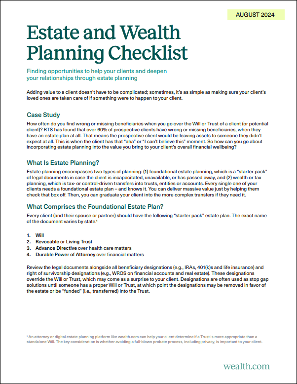 Having estate planning conversations with your clients? Wealth.com has created this checklist to help financial advisors cover all the necessary points while having discussions to help clients optimize their financial planning—wherever they are in their estate planning journey.