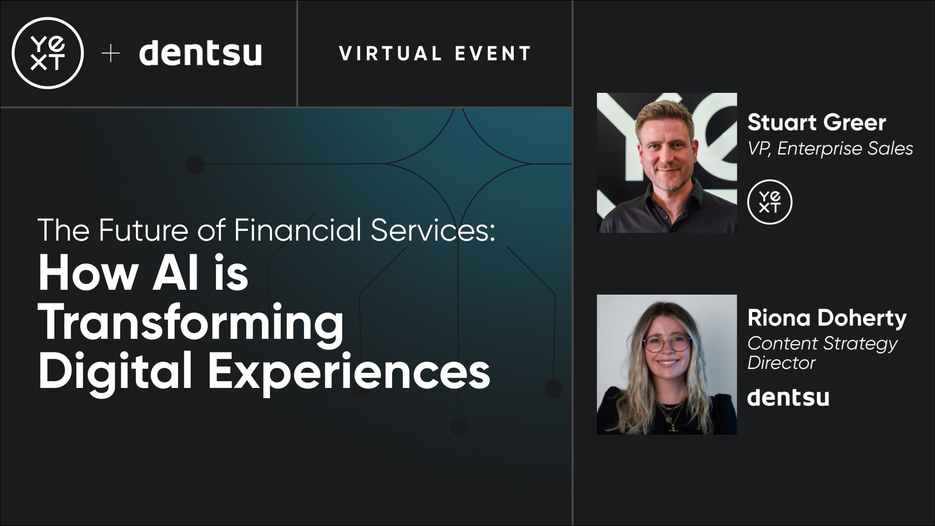 Join Stuart Greer, VP, Enterprise Sales at Yext, and Riona Doherty, Content Strategy Director at Dentsu, for a discussion about how financial services marketers can stay ahead.