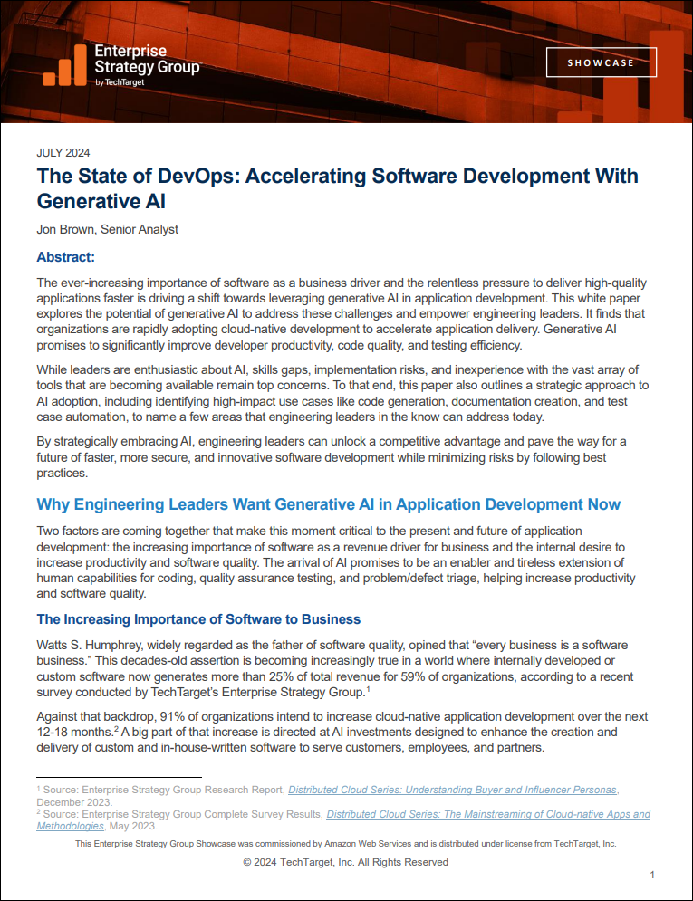 The ever-increasing importance of software as a business driver and the relentless pressure to deliver high-quality applications faster is driving a shift towards leveraging generative AI in application development. This white paper explores the potential of generative AI to address these challenges and empower engineering leaders. It finds that organizations are rapidly adopting cloud-native development to accelerate application delivery. Generative AI promises to significantly improve developer productivity, code quality, and testing efficiency.